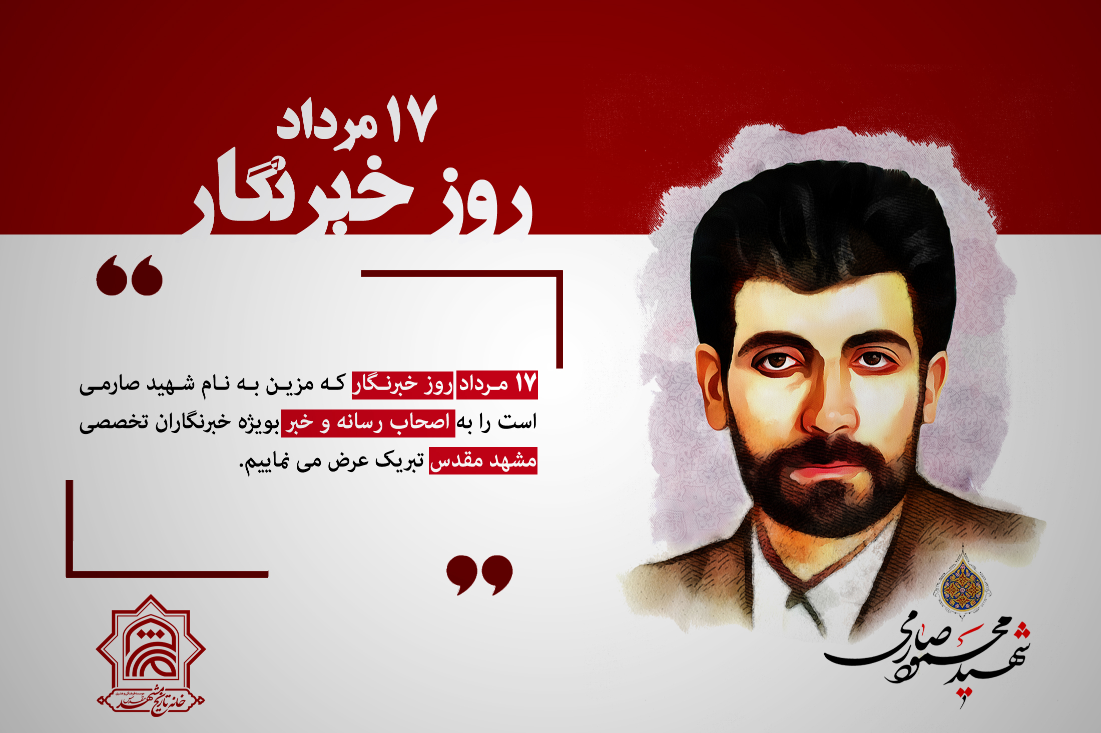 17 مرداد روز خبرنگار که مزین به نام شهید صارمی است را به اصحاب رسانه و خبر بویژه خبرنگاران تخصصی مشهد مقدس تبریک عرض می نماییم.
